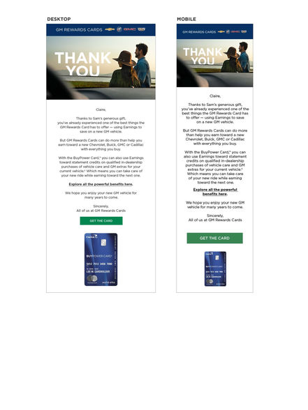 So, instead of standard “Spend!Spend!Spend!” holiday messaging, we shared a new one: “Give, Give, Give.” With the Give List, Cardmembers could “gift” $1,000 of money they’d earned to one or two special someones — and it wouldn’t cost a thing. Their lucky recipient(s) could then use that gift toward a new GM Vehicle.